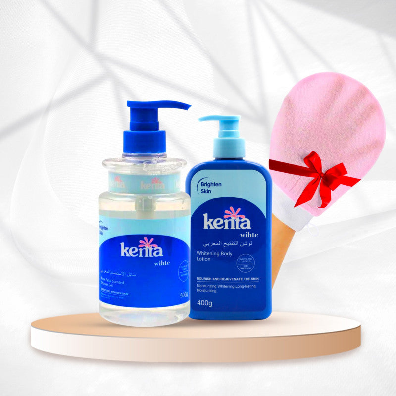 دلّلي نفسك بروتين عناية مغربي متكامل مع باقة كينتا وايت للجسم. تركيبة لطيفة وفعالة تمنحك نعومة، ترطيب، وتفتيح تدريجي لبشرة الجسم.