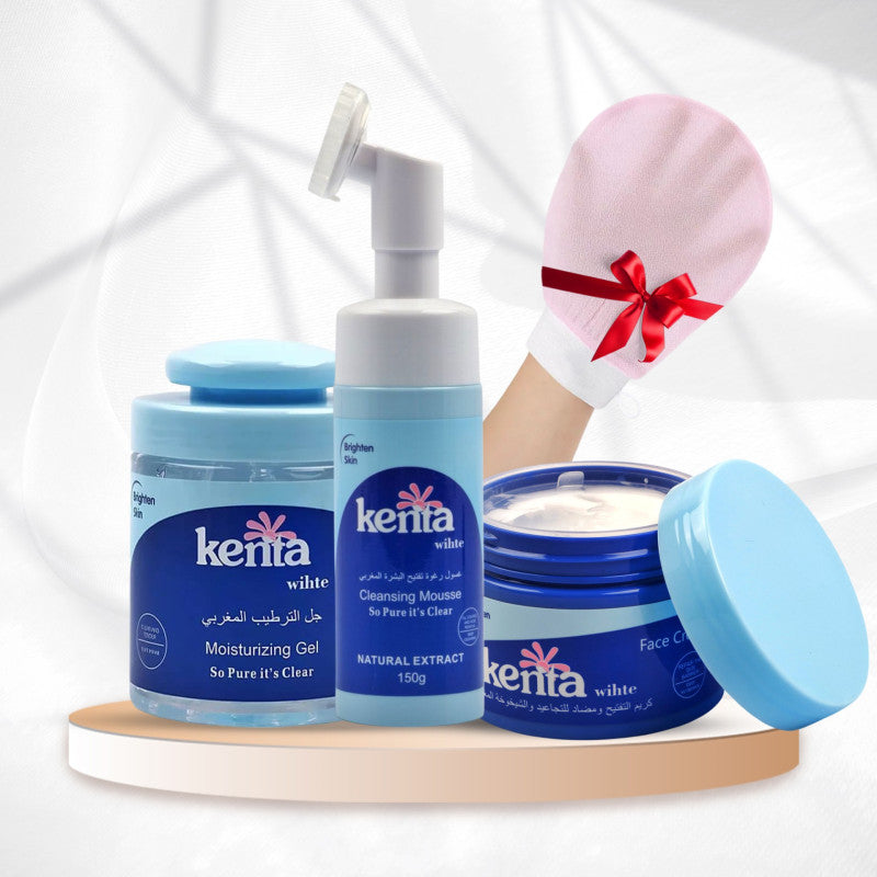 ابدئي روتينك اليومي مع باقة Kenta White للعناية المتكاملة بالوجه – تركيبة مغربية فعالة تجمع بين التفتيح، الترطيب، محاربة التجاعيد، وتنظيف البشرة، بخطوات بسيطة تناسب جميع أنواع البشرة.