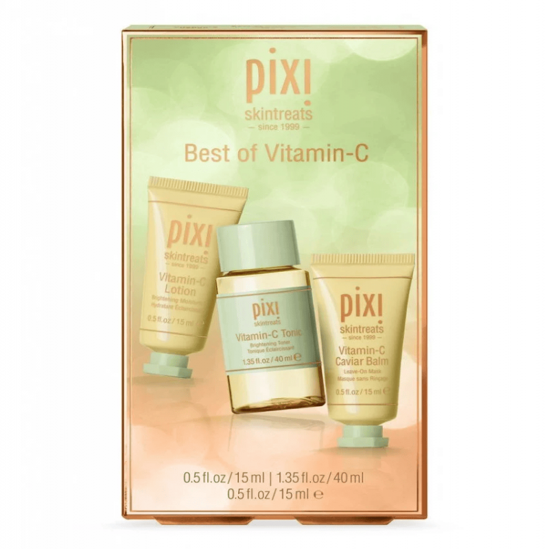 مجموعة بيكسي العالمية المكونة من ثلاث قطع للعناية بالبشرة المدعمة بفيتامين سي أو ج، تحتوي هذه المجموعة على لوشن فيتامين سي بحجم 15 مل يعمل على تفتيح البشرة و نضارتها، تونيك فيتامين سي بحجم 40 مل يجعل بشرتك حريرية و بلون متوحد، بلسم الكافيار بفيتامين سي بحجم 15 مل و الذي يعمل على ترطيب البشرة القوي و العميق