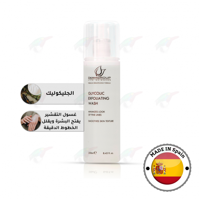 مجموعة ديرم - غسول مقشر بالجلايكوليك غسول التقشير بحمض الجلايكوليك المنعش والنقي والممزوج مع منشطات ترطيب البشرة، عند استخدامه سيكون رغوة خفيفة للتنظيف العميق. هذا الغسول يفتح مسام البشرة ويقلل الخطوط الدقيقة فيها ويخلق إشراقة شبابية.