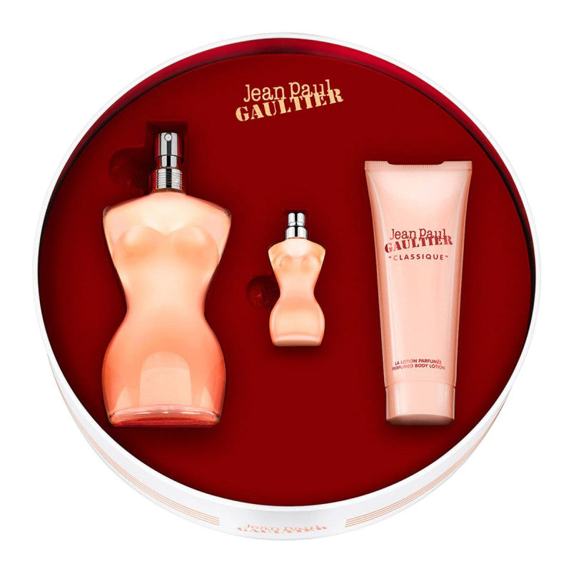 مجموعة عطرية فاخرة من جين بول جولتير للنساء تحتوي على عطر أساسي بحجم 100 مل مع عبوة 6 مل من نفس العطر، ولوشن ملطف للبشرة بحجم 75 مل.
