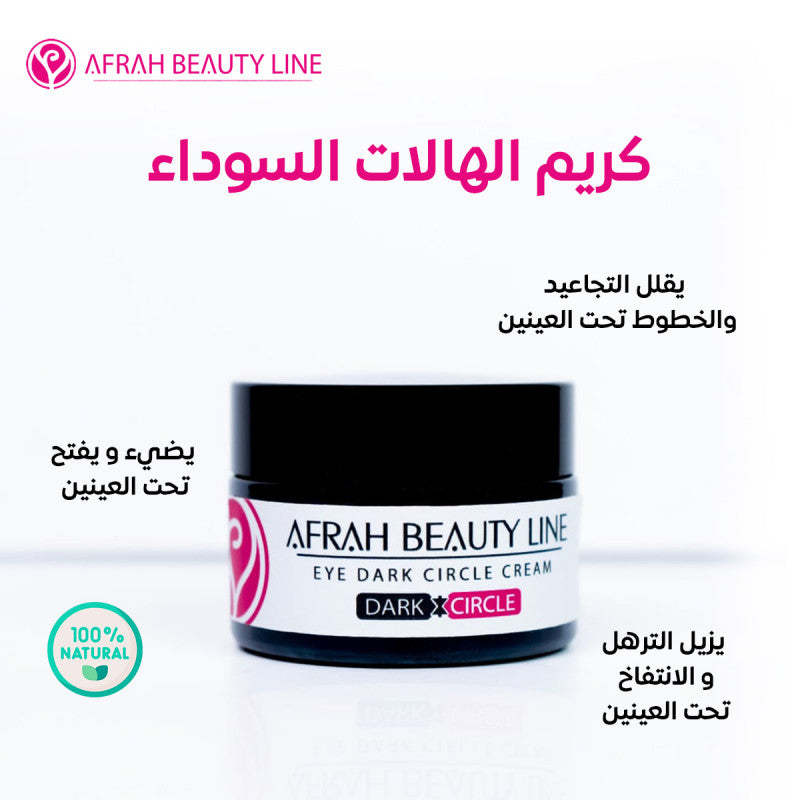 كريم الهالات السوداء للعين من أفراح بيوتي لاين هو كريم مثالي لتجديد خلايا محيط العينين ، فهو يساعد في ازالة جميع الهالات و التجاعيد المتشكلة حول العينين. يحمي البشرة من الأشعة فوق البنفسجية و يرمم و يجدد الخلايا كما يساعد في استعادة الرطوبة والمرونة وزيادة المقاومة تجاه العوامل البيئية. قوام الكريم خفيف جداً و تمتصه البشرة بسرعة دون ترك يترك أي ملمس دهني مزعج