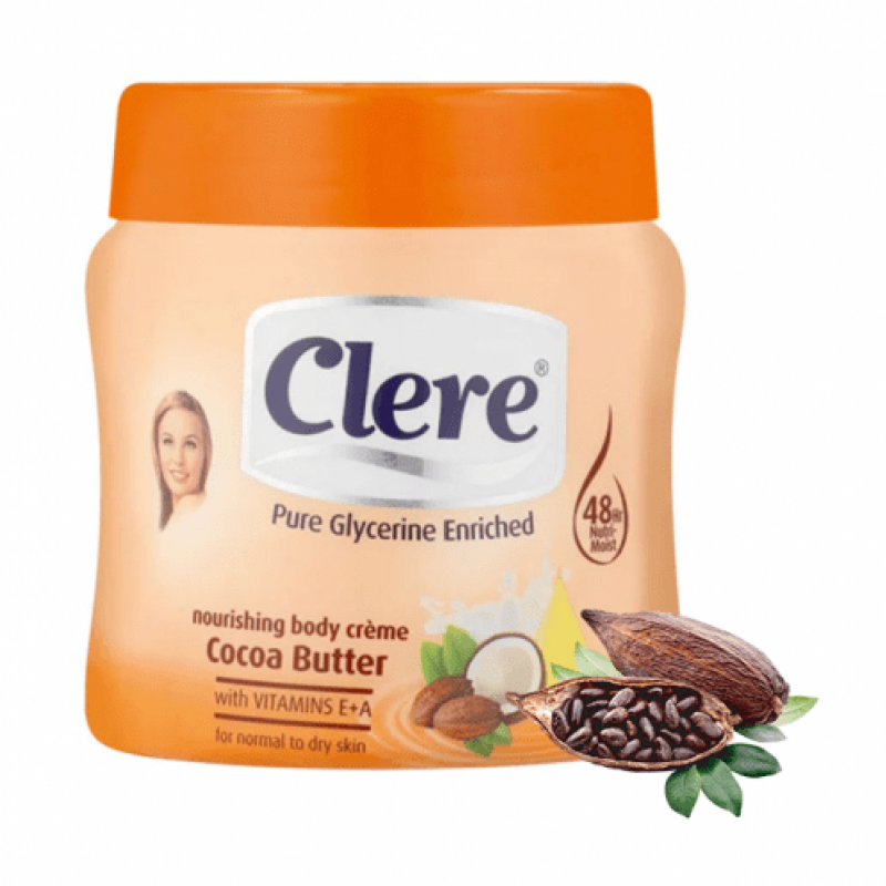 كريم clere 500ml الغني بزبدة الكاكاو الذي سيمنح بشرتك الترطيب العالي ويحارب الجفاف، وبفضل زبدة الكاكاو التي تحتوي على أحماض دهنية بنسبة عالية ستساعد الجلد على الحفاظ على مرونته وترطيبه وتعتبر زبدة الكاكاو مهمة للبشرة لمحاربة شيخوخة الجلد المبكرة.